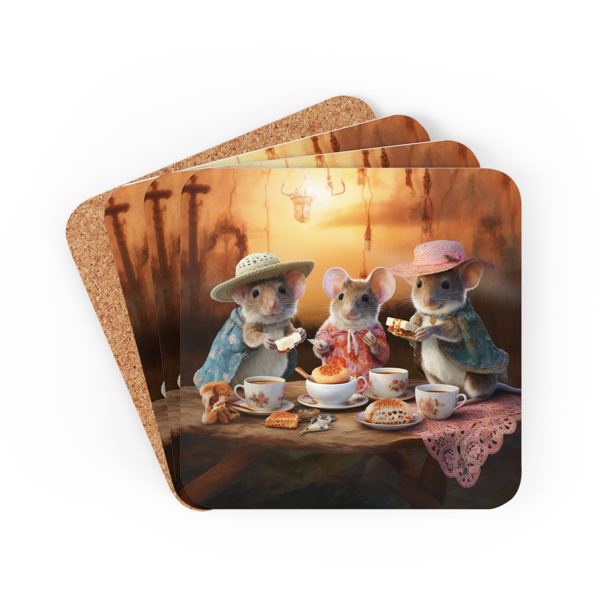 Delight in the whimsy of our Dawn's Delight - Native Australian Mice Tea Party Coaster Set, each crafted meticulously with an eye for detail. This unique quartet pays homage to the enchanting outback with its portrayal of a group of native Australian mice, merrily partaking in a dawn tea party.