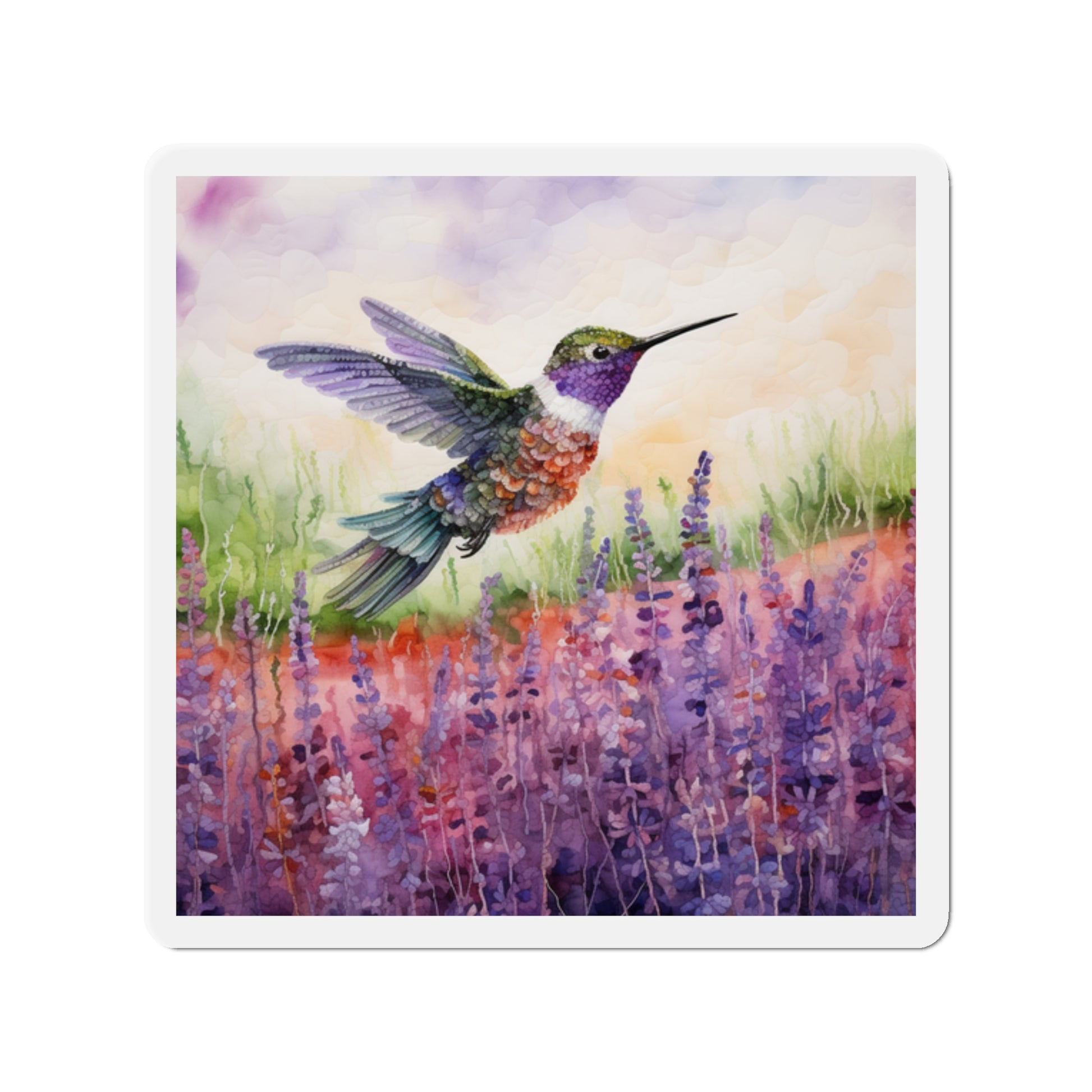 Discover the enchanting beauty of our magnet, featuring a watercoloured painting of a hummingbird in a lavender field. This delicate piece captures the hummingbird's grace as it hovers above vibrant lavender blossoms, blending soft hues to create a dreamlike scene. Crafted with precision, the magnet offers a touch of nature's elegance for your home or office. It's a perfect gift for those who appreciate art and the serene charm of the outdoors. Add this unique magnet to your collection and let it transport you to a tranquil countryside.