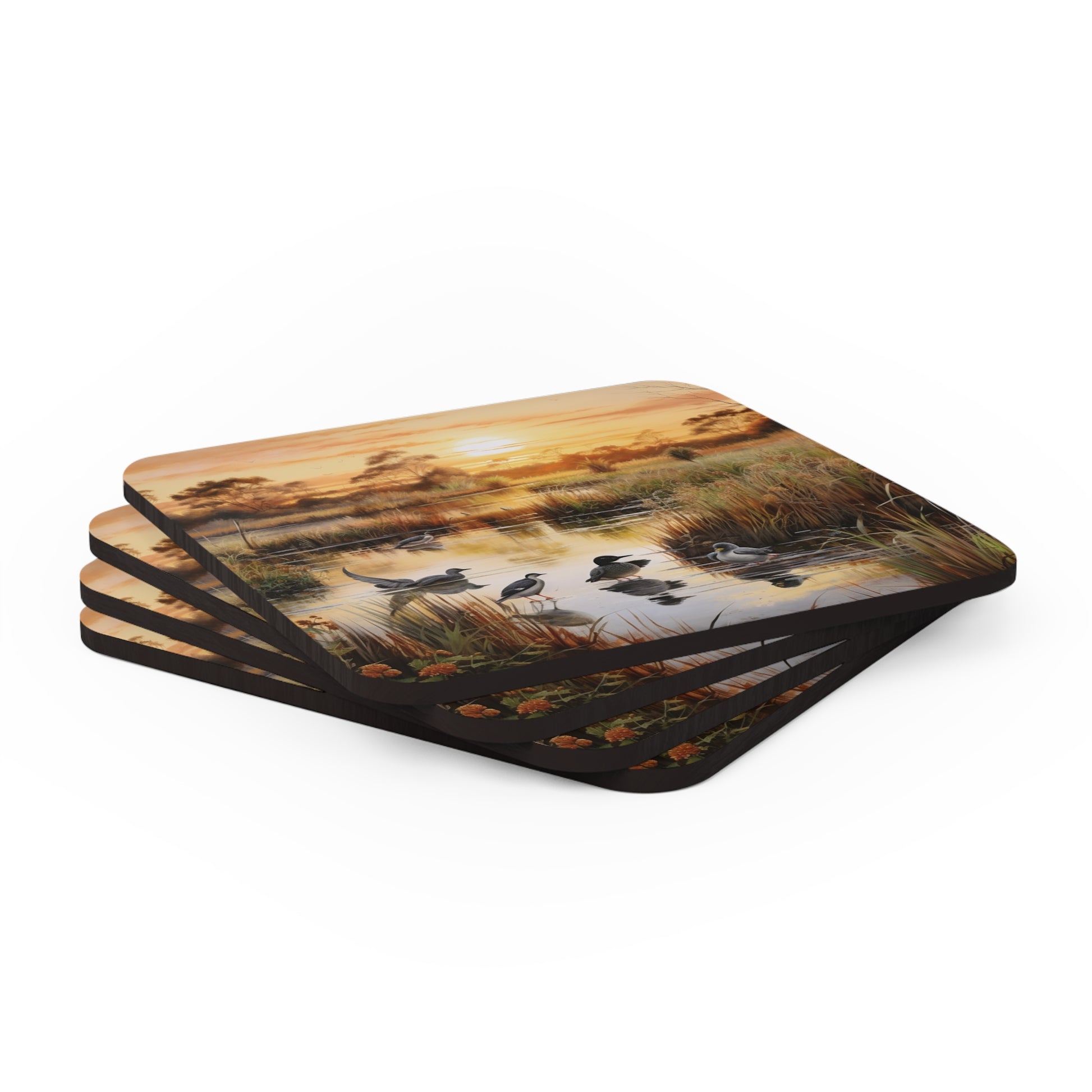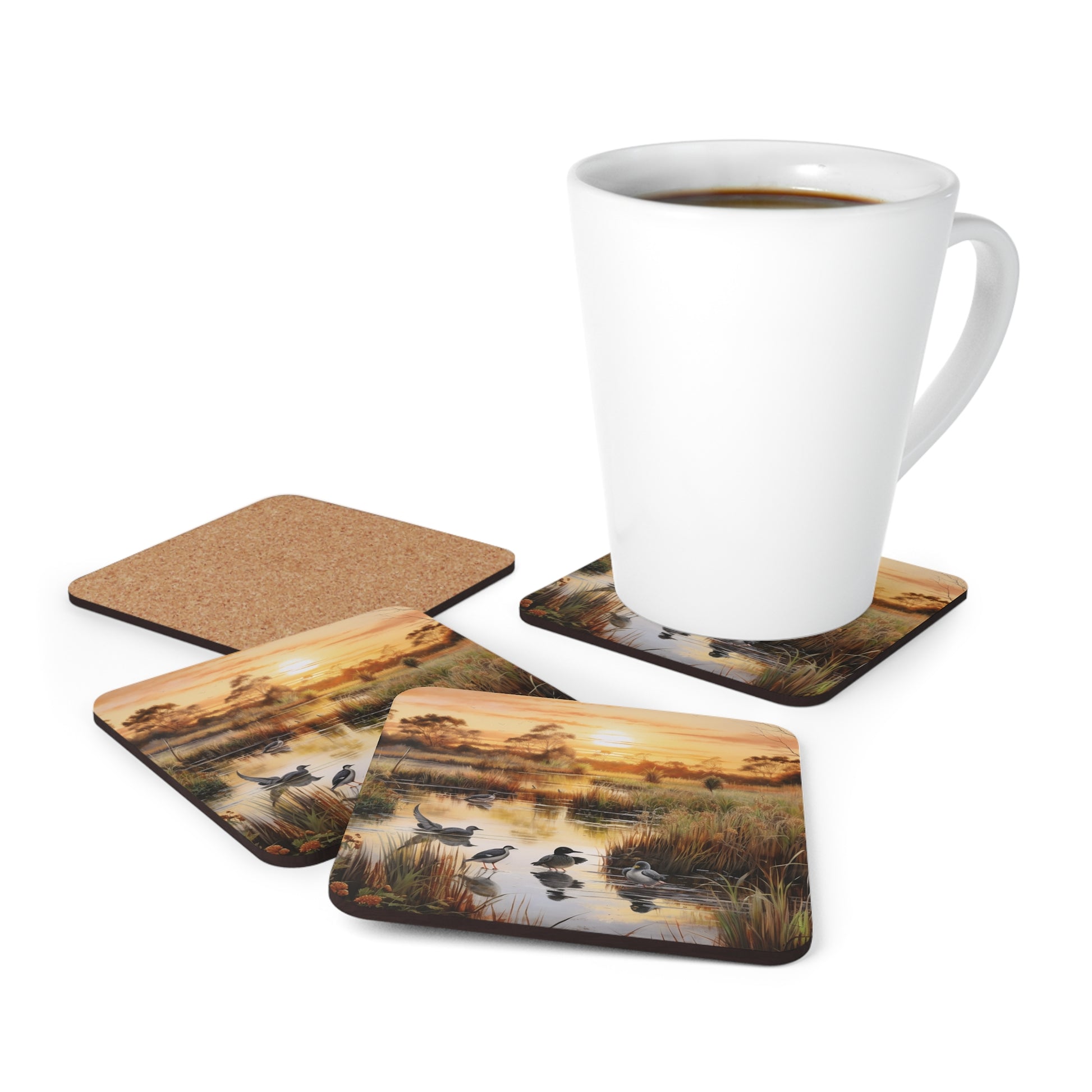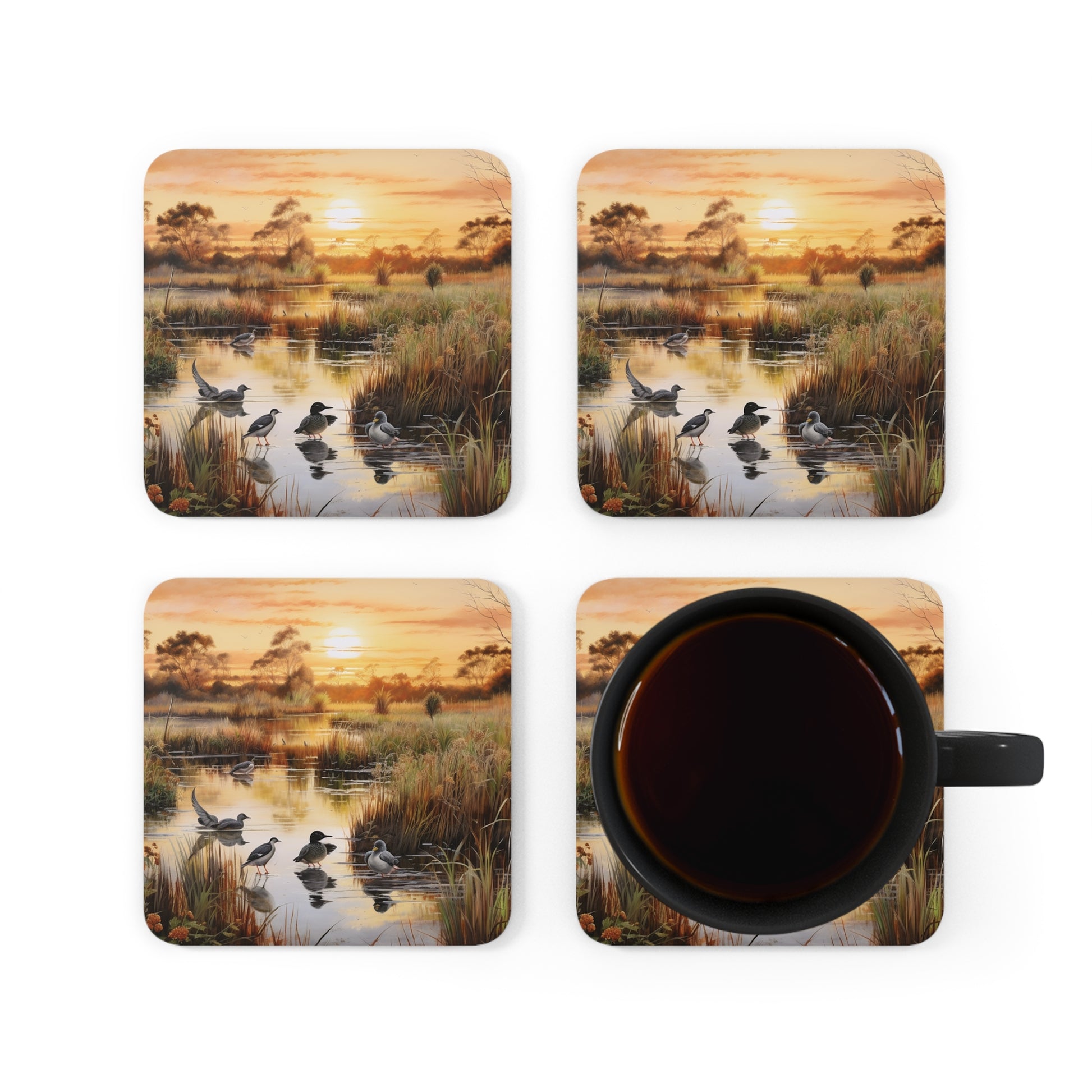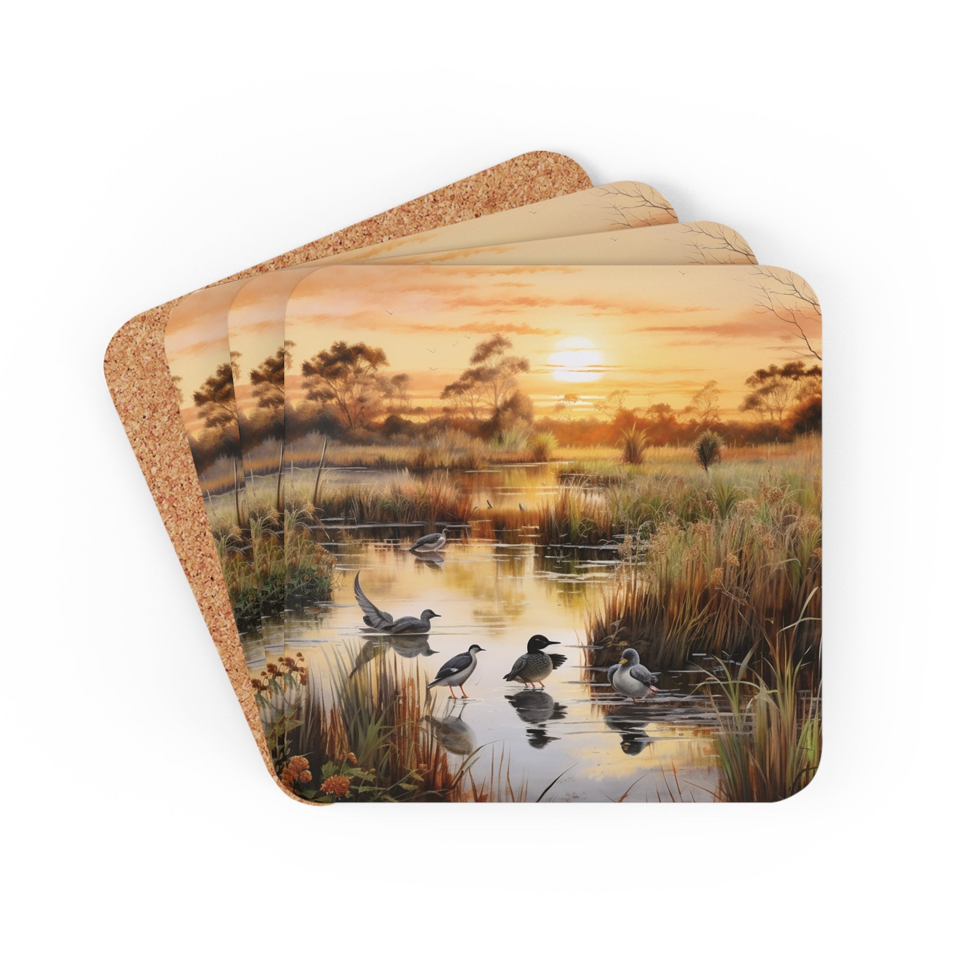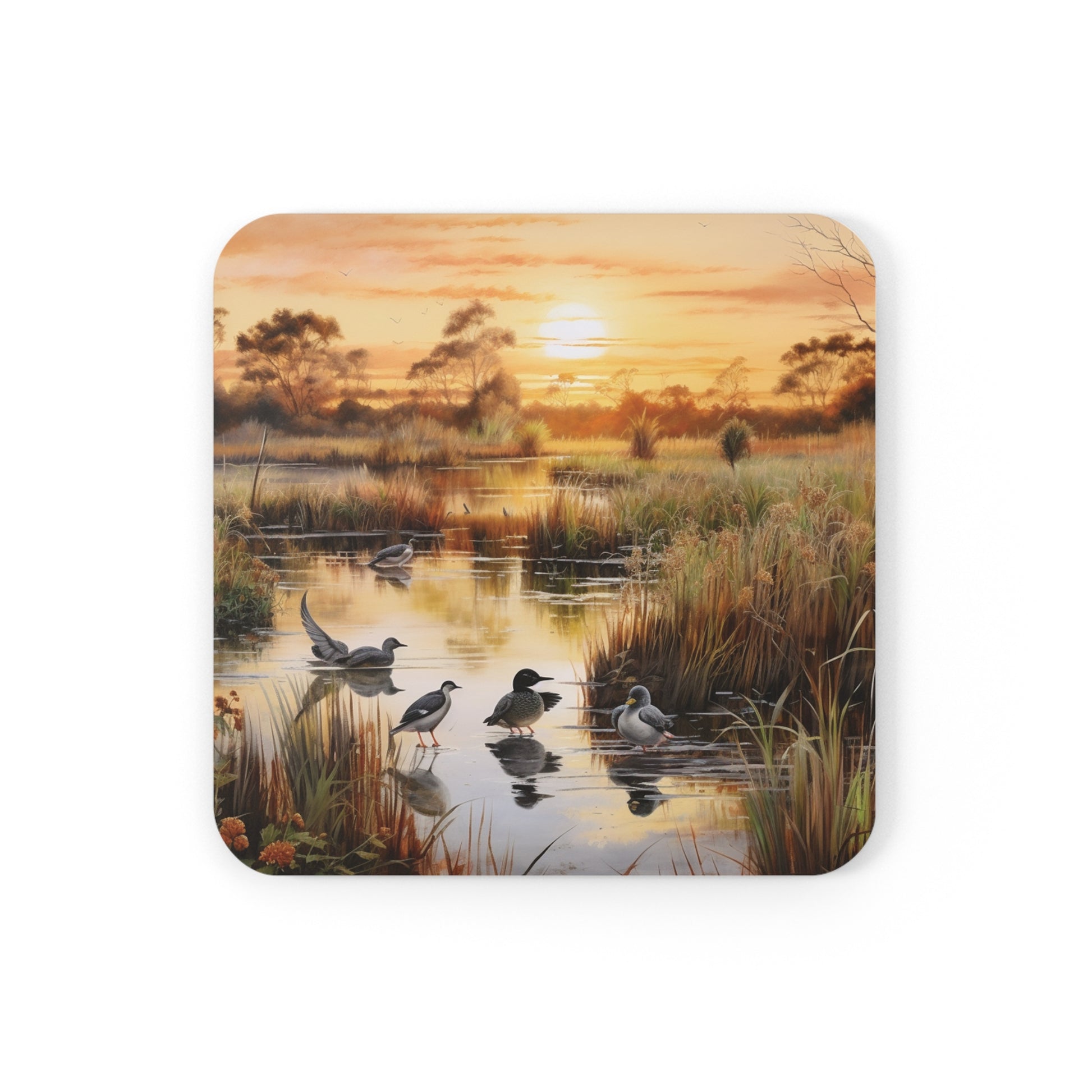 These premium quality coasters, sold in a set of four, feature delicate watercolour renditions of native Australian birds in their natural habitat - the pristine, sunrise-touched wetlands. Each coaster showcases a different birds. Their vibrant colours against the soft, golden hue of the dawn sky will add a dash of elegance and charm to your coffee table.