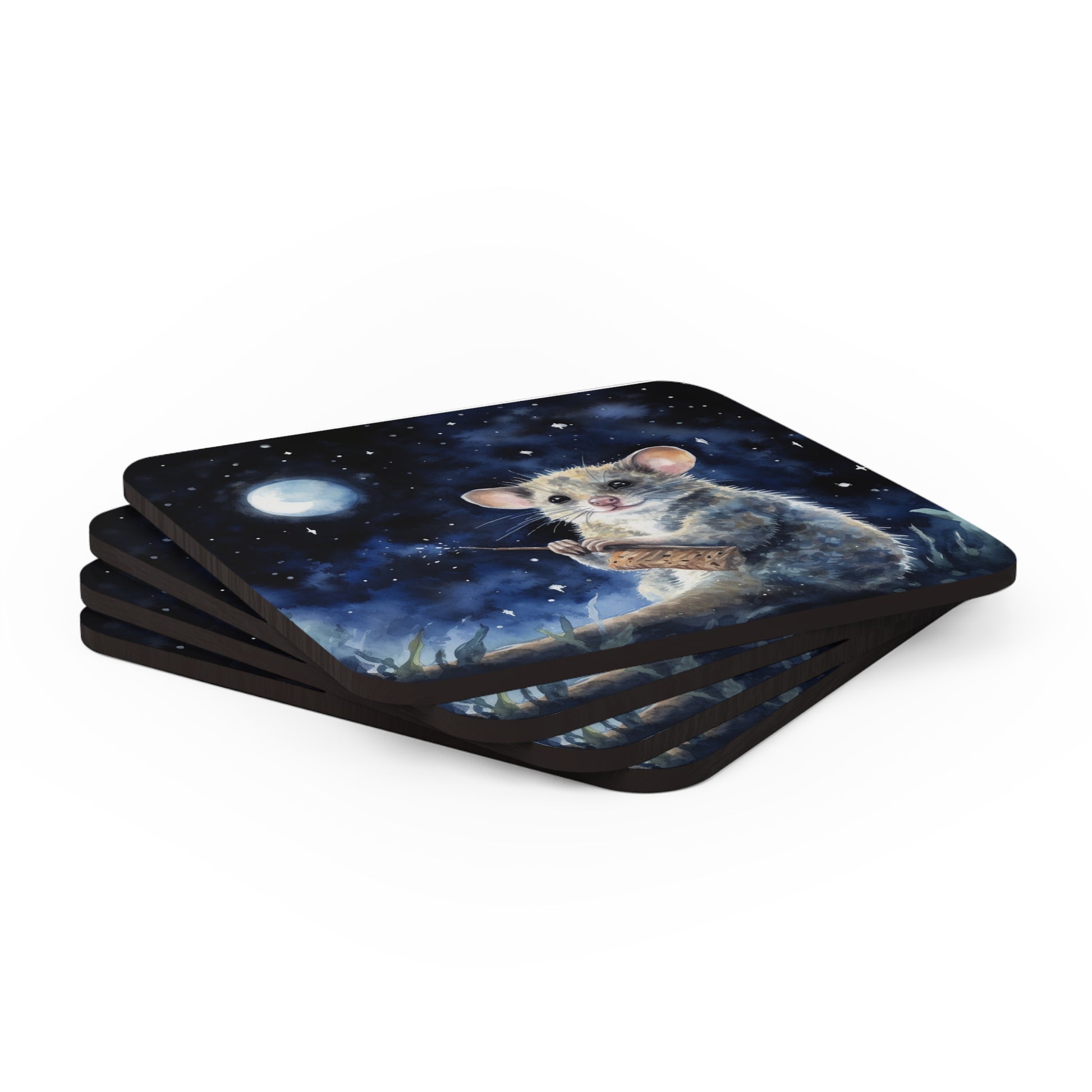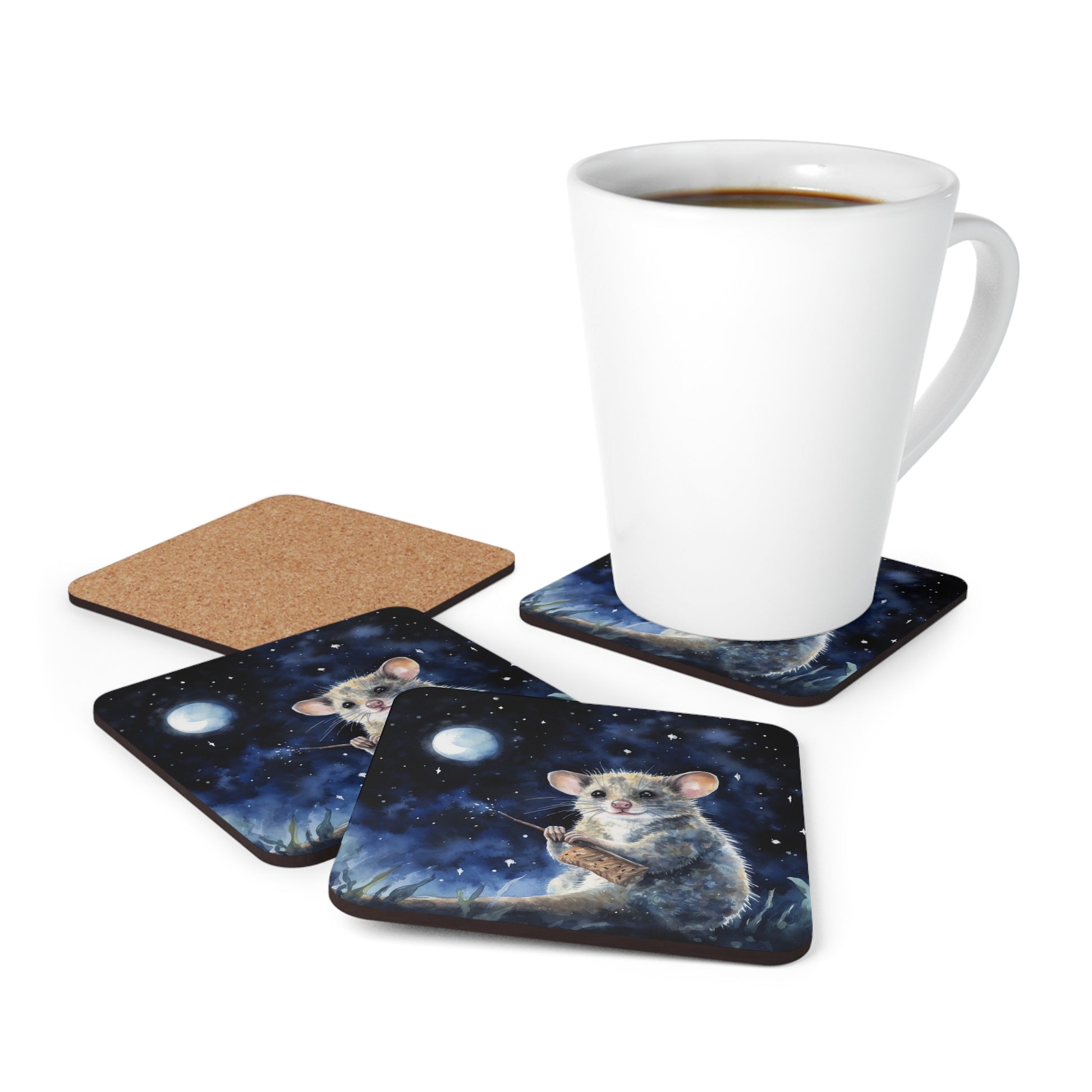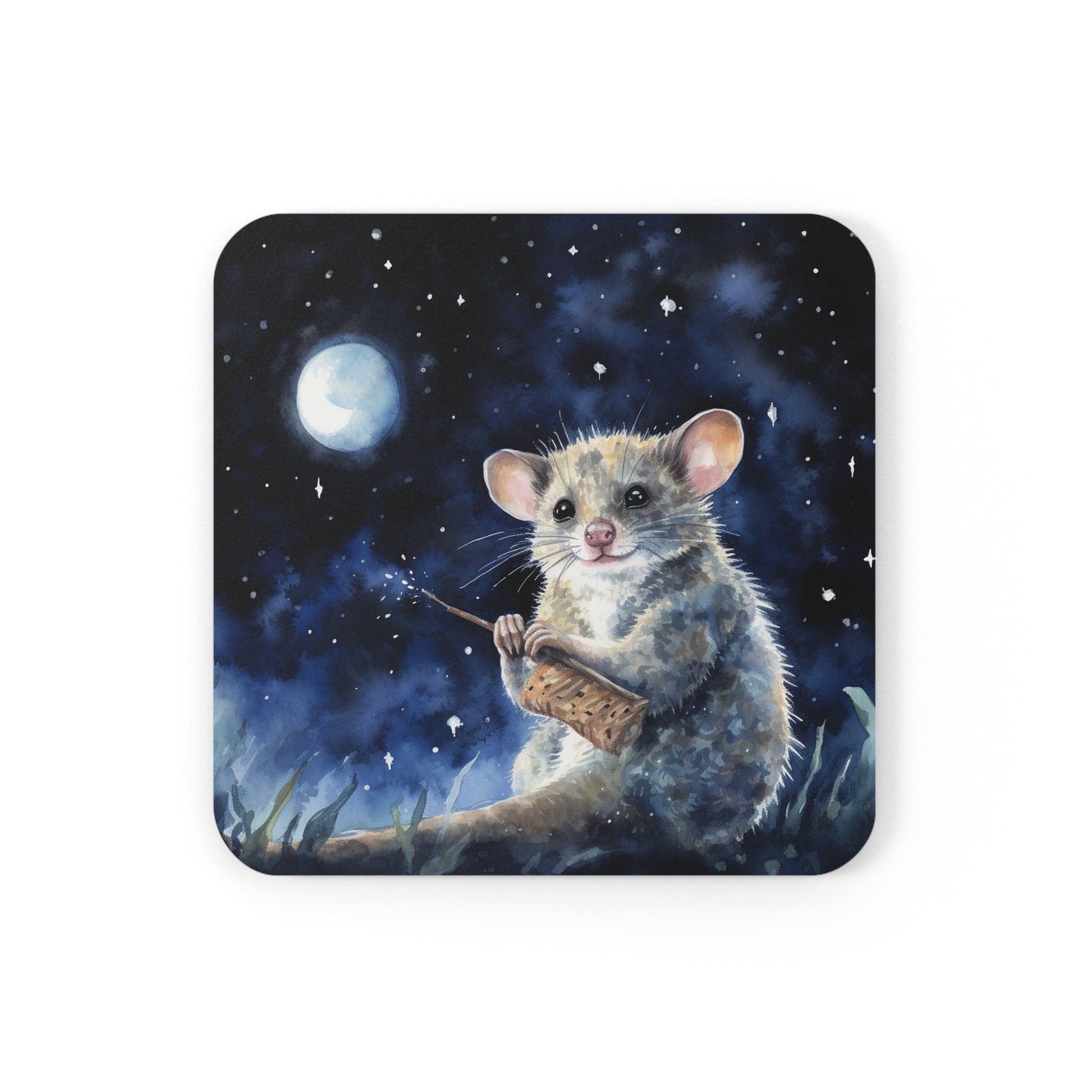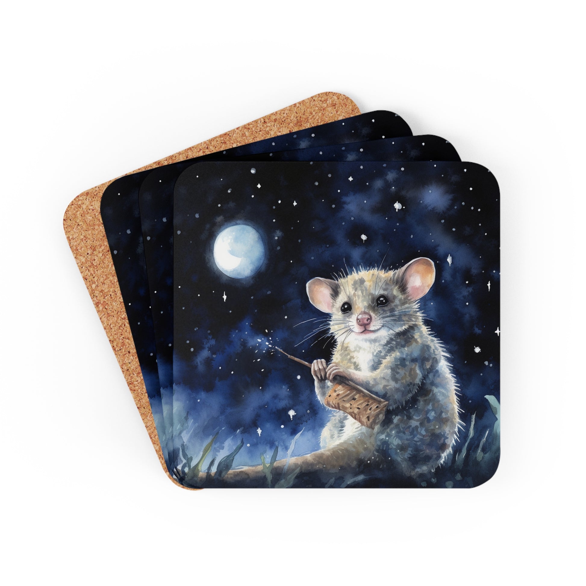 Introducing our exclusive set of 4 coasters, each beautifully adorned with a watercoloured painting of a possum under a starry night sky with a full moon in the native Australian outback. These coasters capture the mystical allure of the wilderness, portraying a possum's nocturnal adventure amidst the vast landscape.