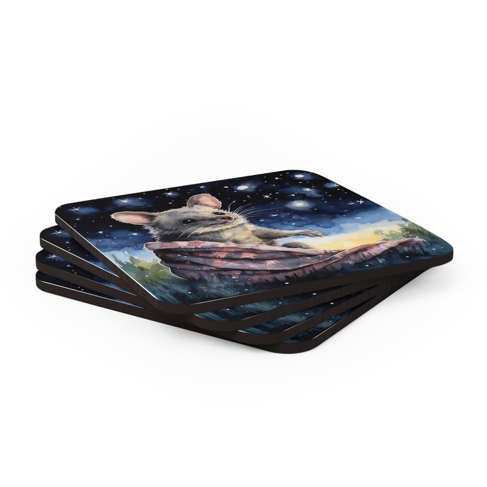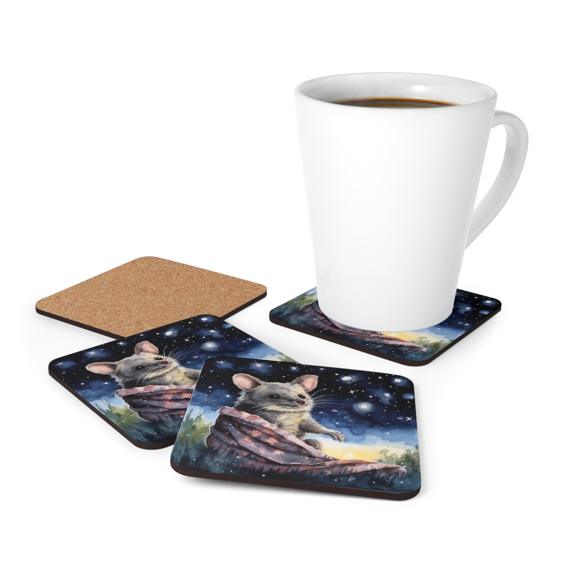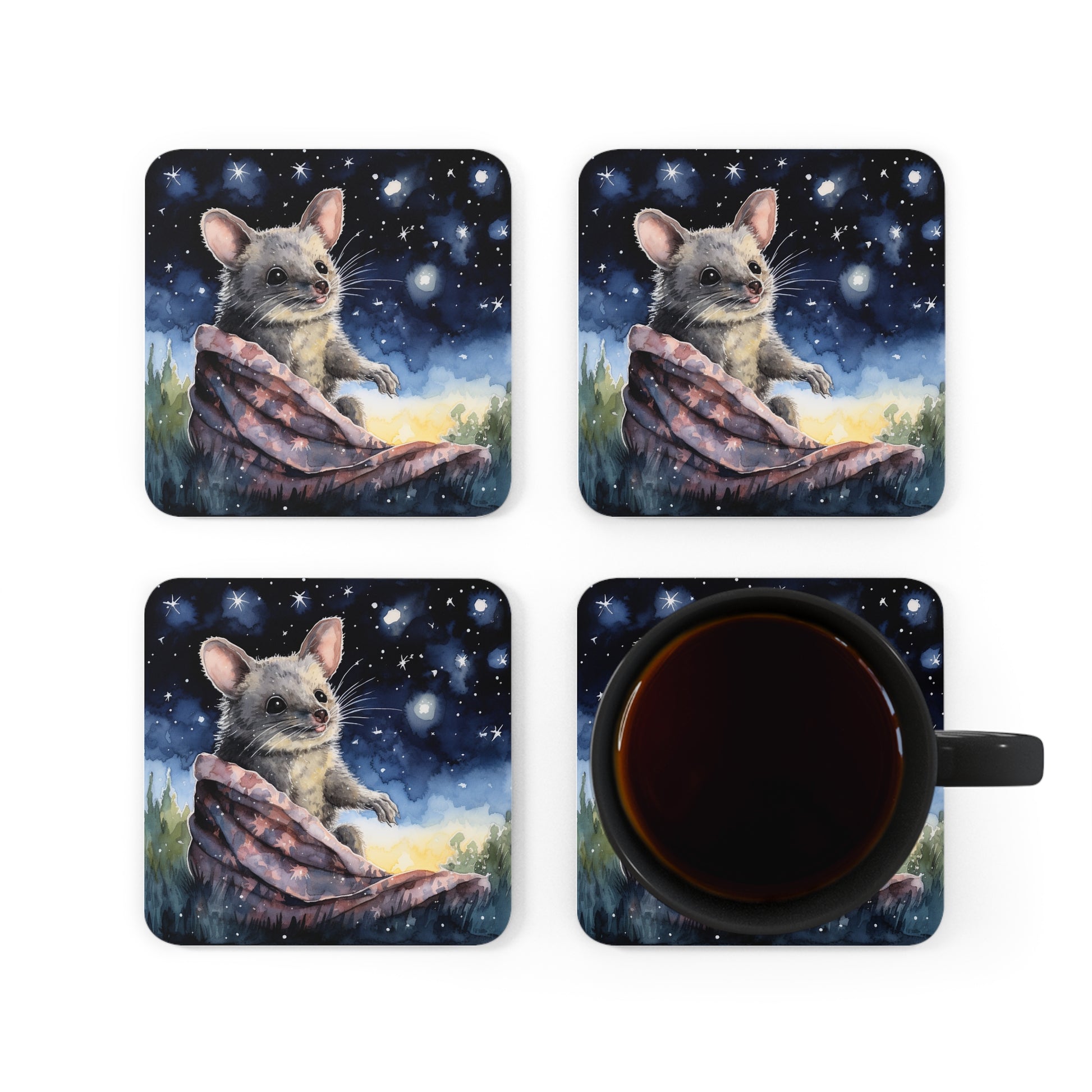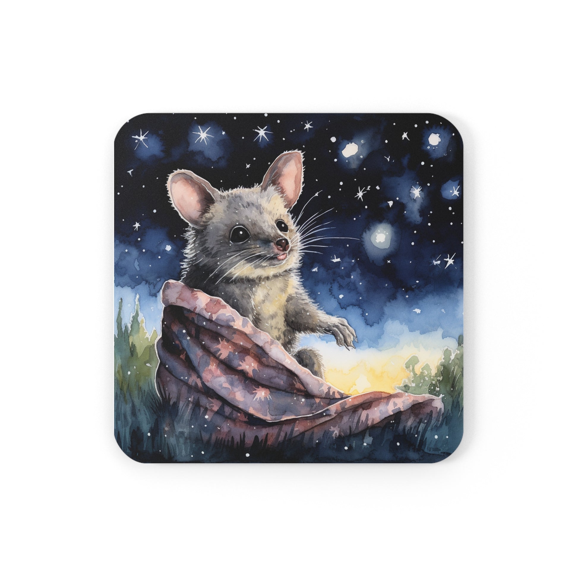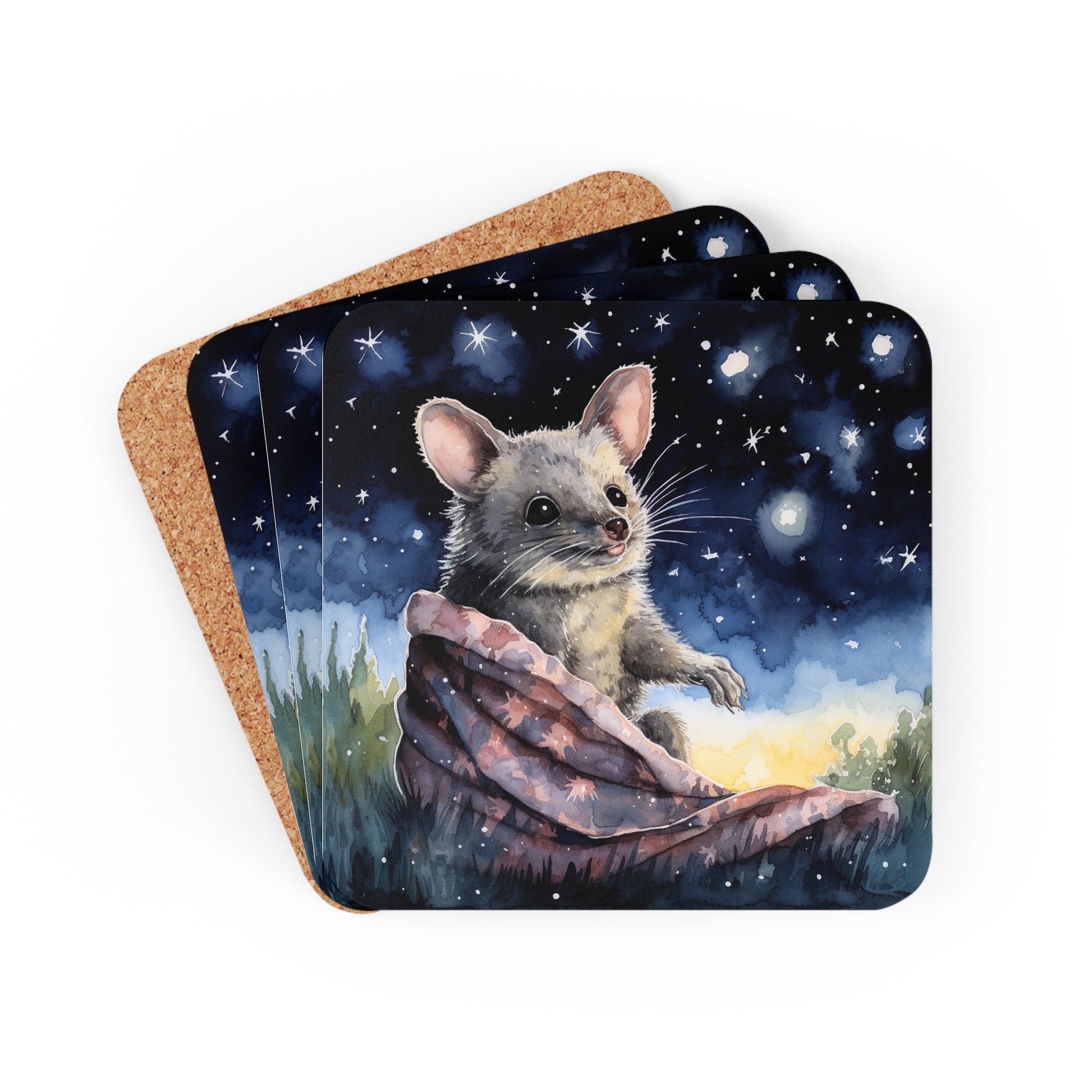 Introducing our exclusive set of 4 coasters, each beautifully adorned with a watercoloured painting of a possum under a starry night sky with a full moon in the native Australian outback. These coasters capture the mystical allure of the wilderness, portraying a possum's nocturnal adventure amidst the vast landscape.