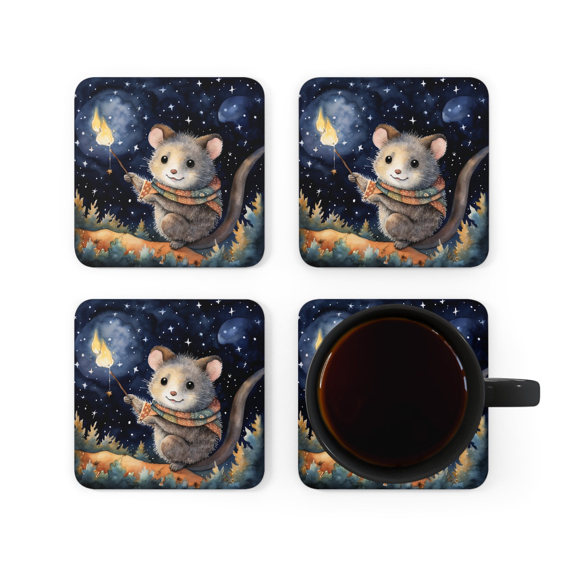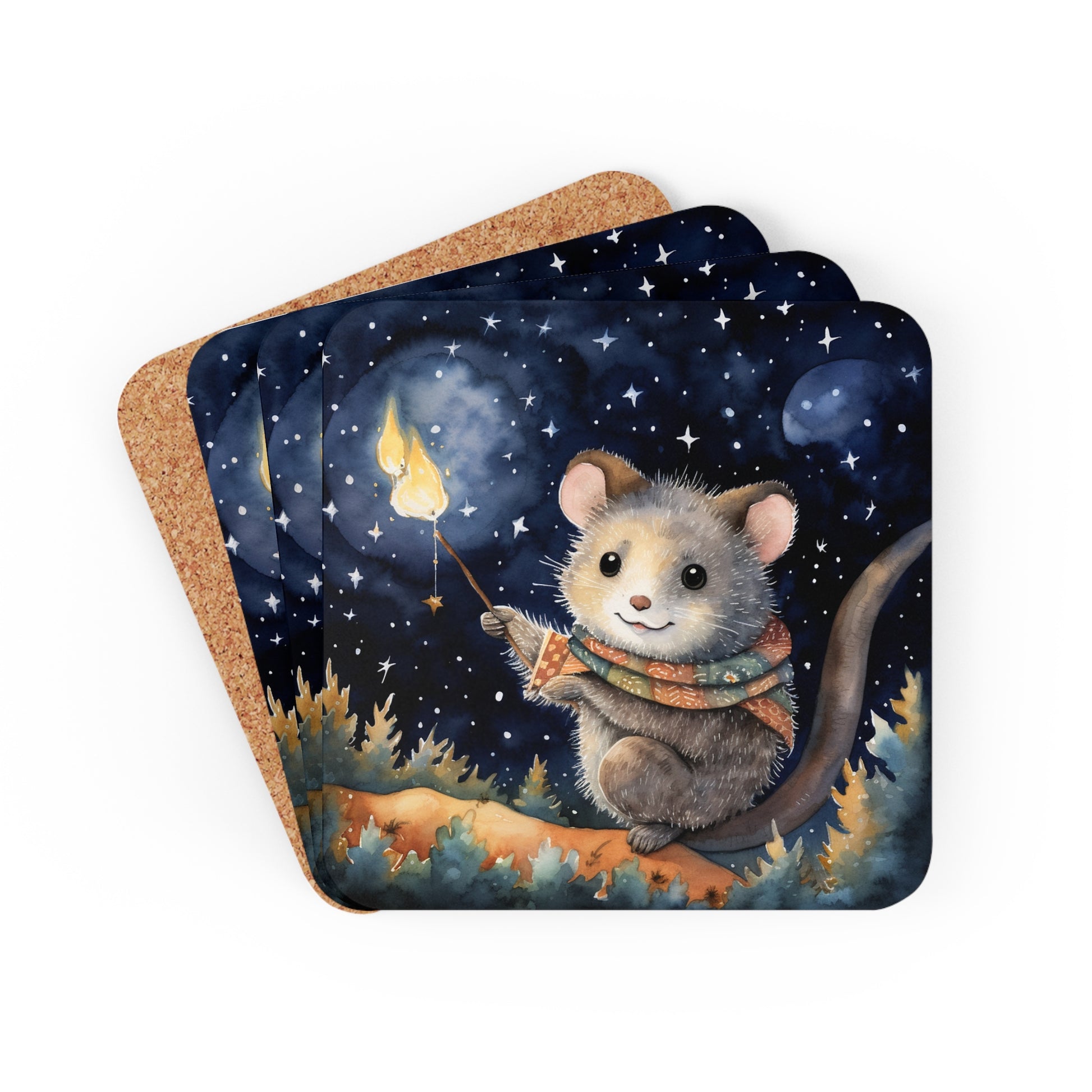 Introducing our exclusive set of 4 coasters, each beautifully adorned with a watercoloured painting of a possum under a starry night sky with a full moon in the native Australian outback. These coasters capture the mystical allure of the wilderness, portraying a possum's nocturnal adventure amidst the vast landscape.