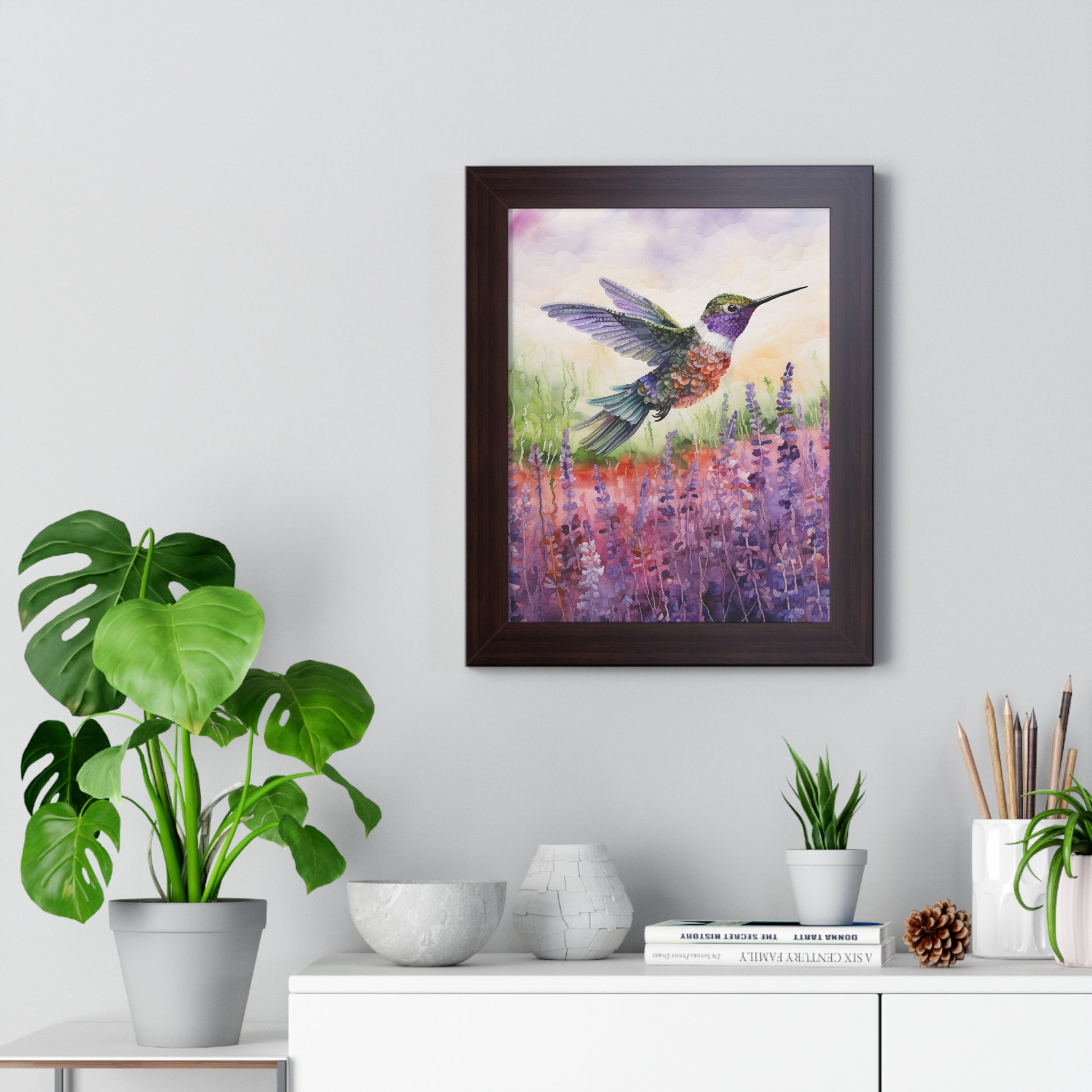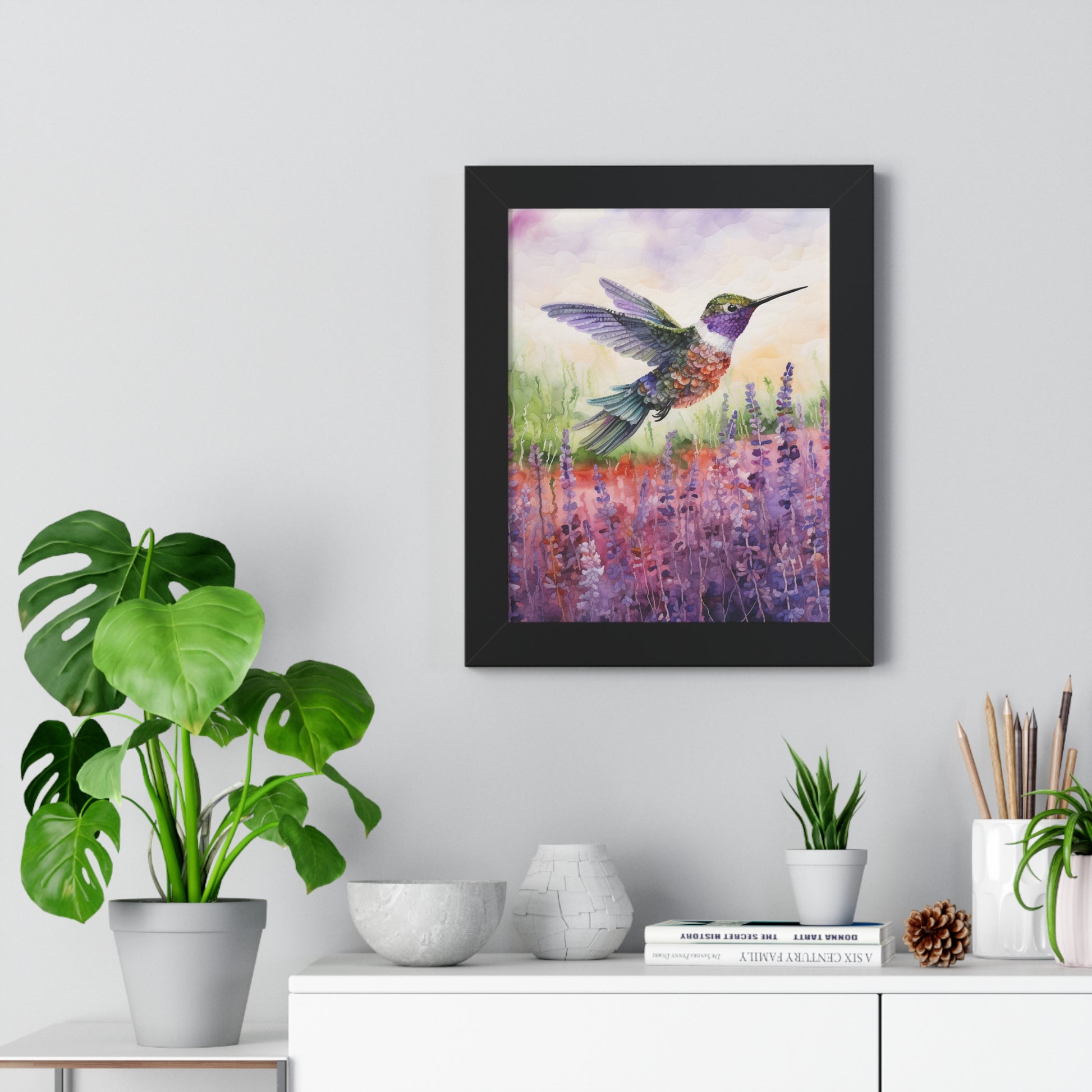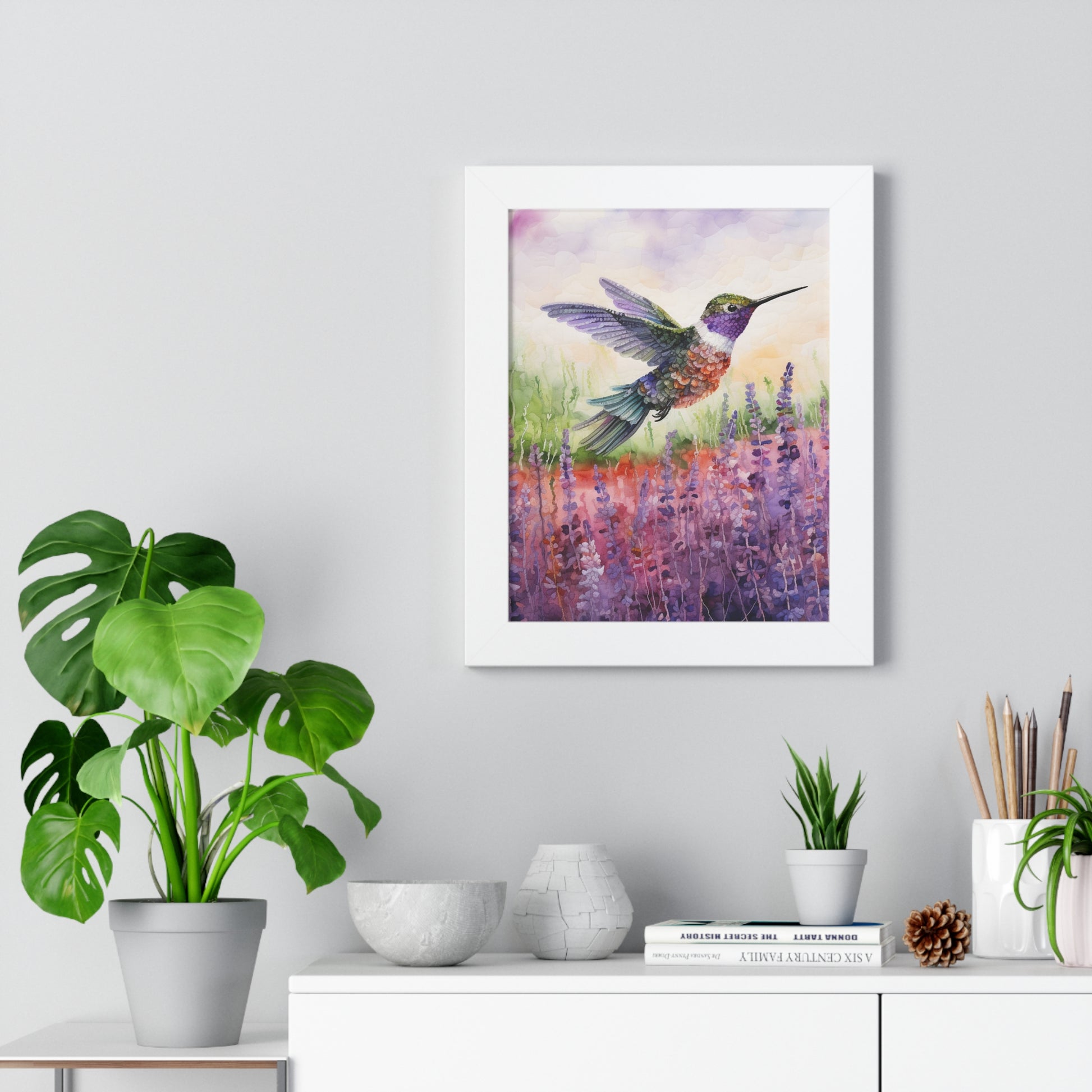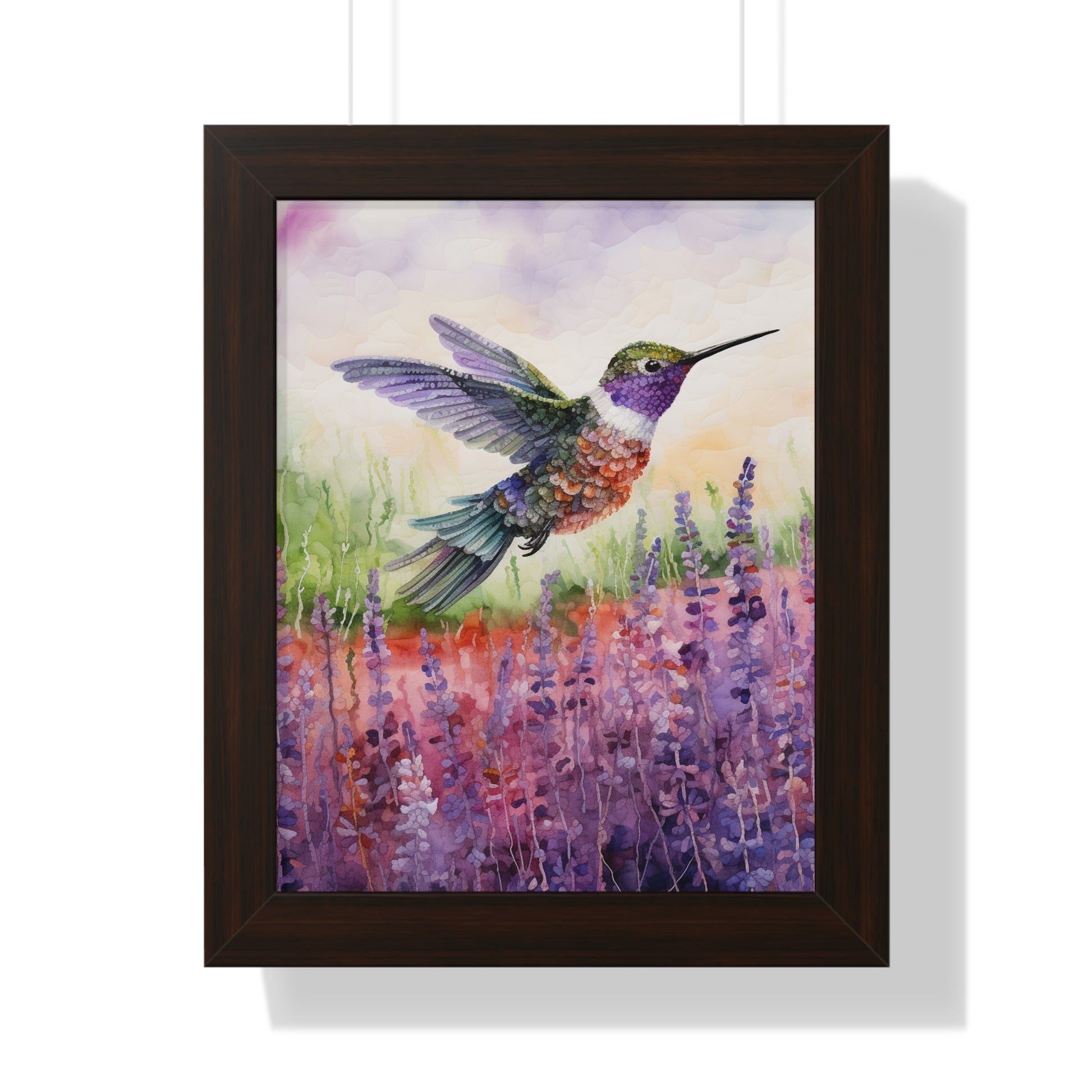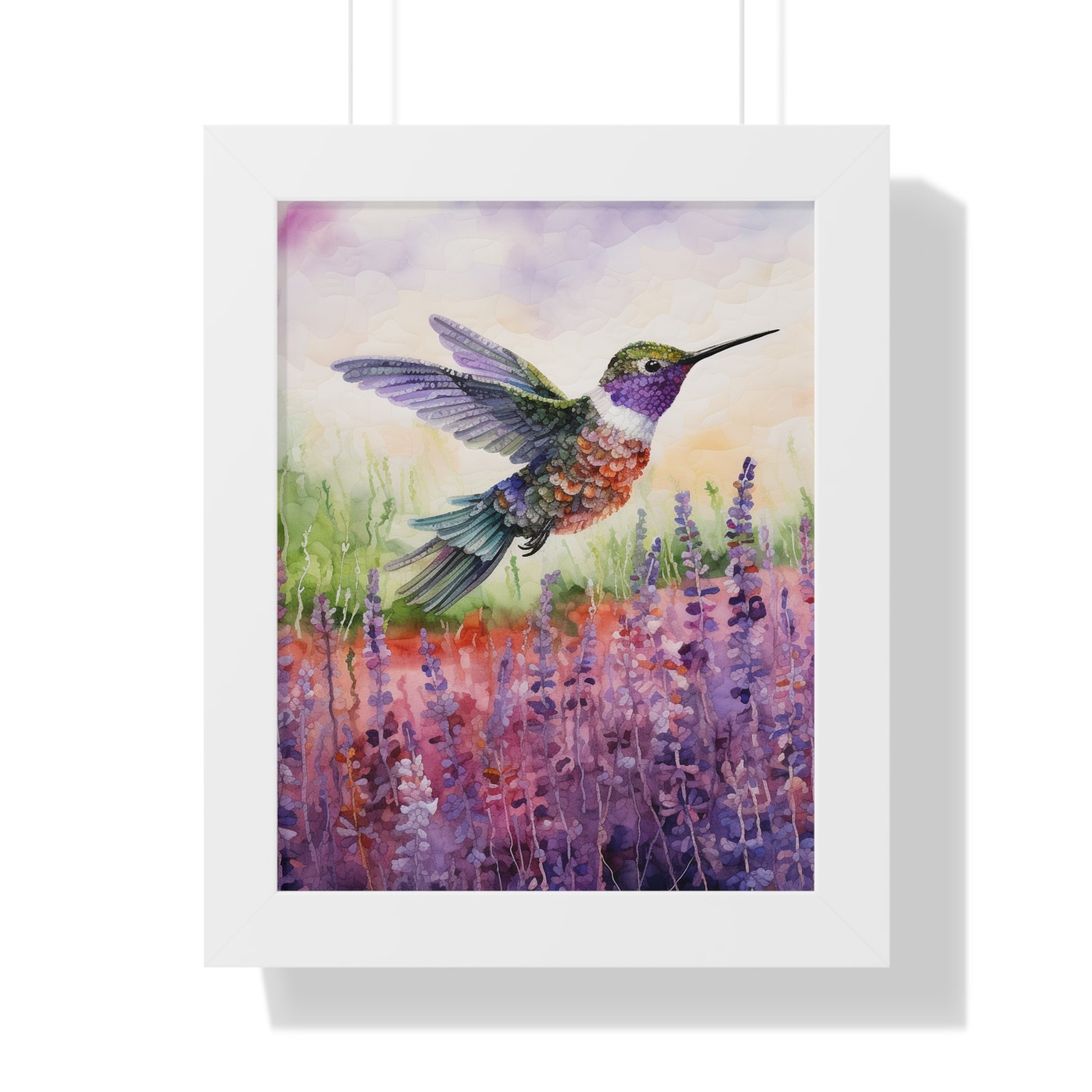 The "Threaded Wings" collection offers an enchanting series of watercoloured paintings, each featuring a delicate hummingbird captured in mid-flight against the serene backdrop of lavender fields. The artist masterfully employs gentle brush strokes and soft hues to convey the ethereal beauty of the blossoming lavender, juxtaposed with the agility and grace of the hummingbirds.