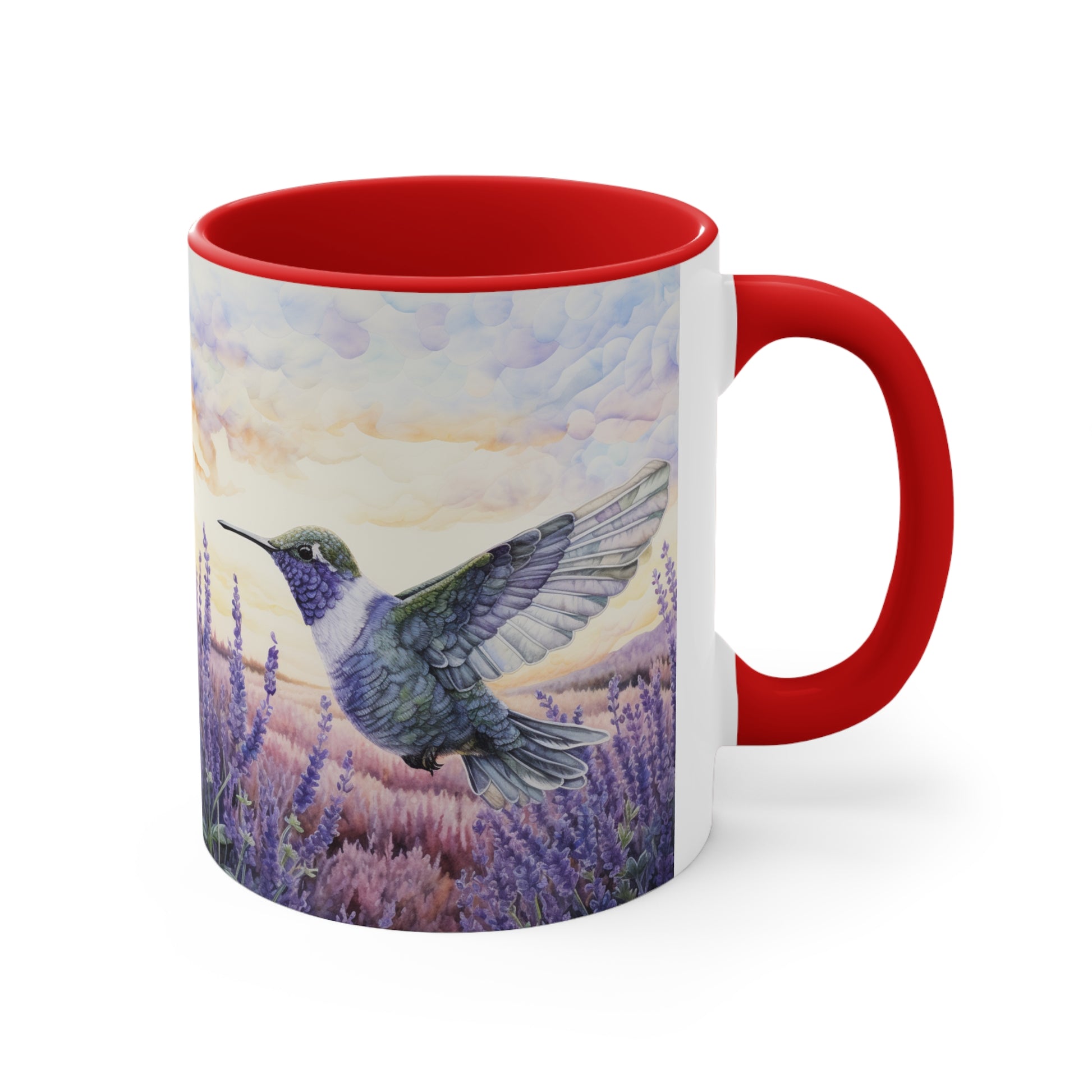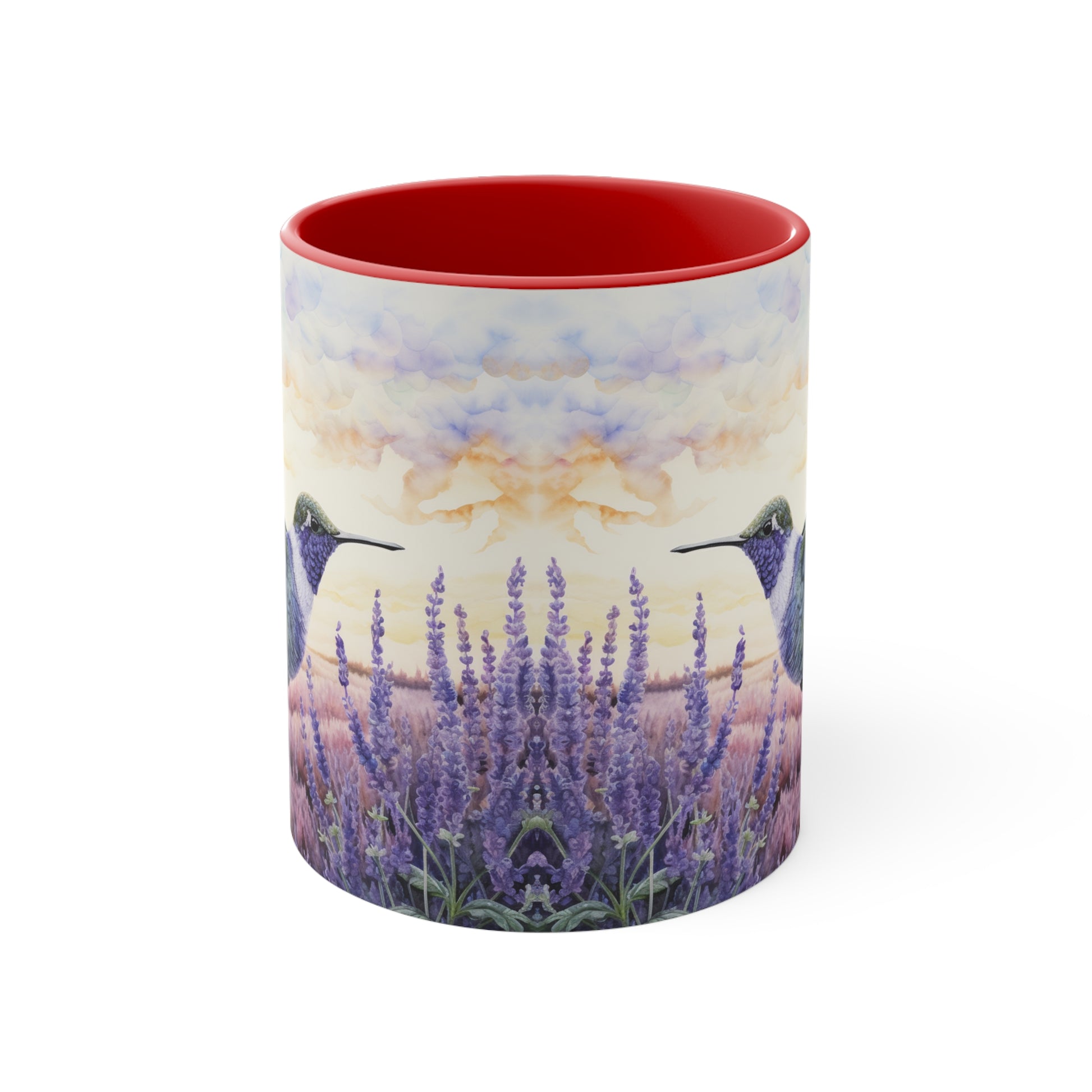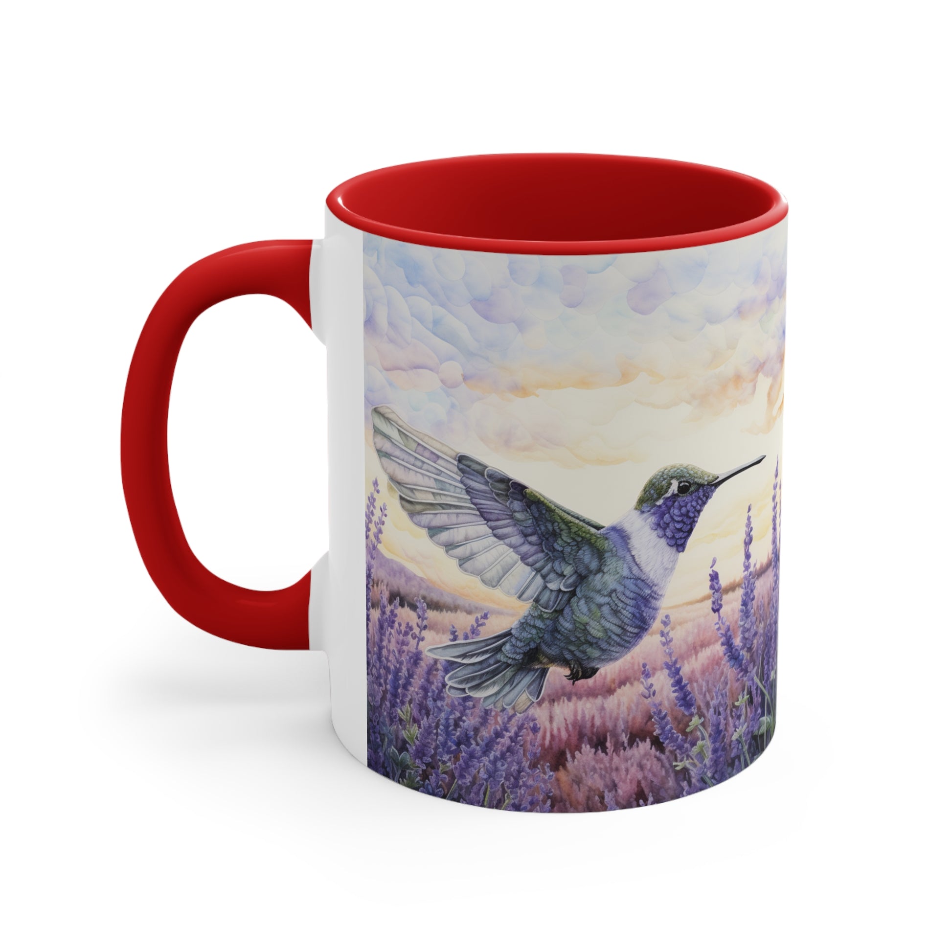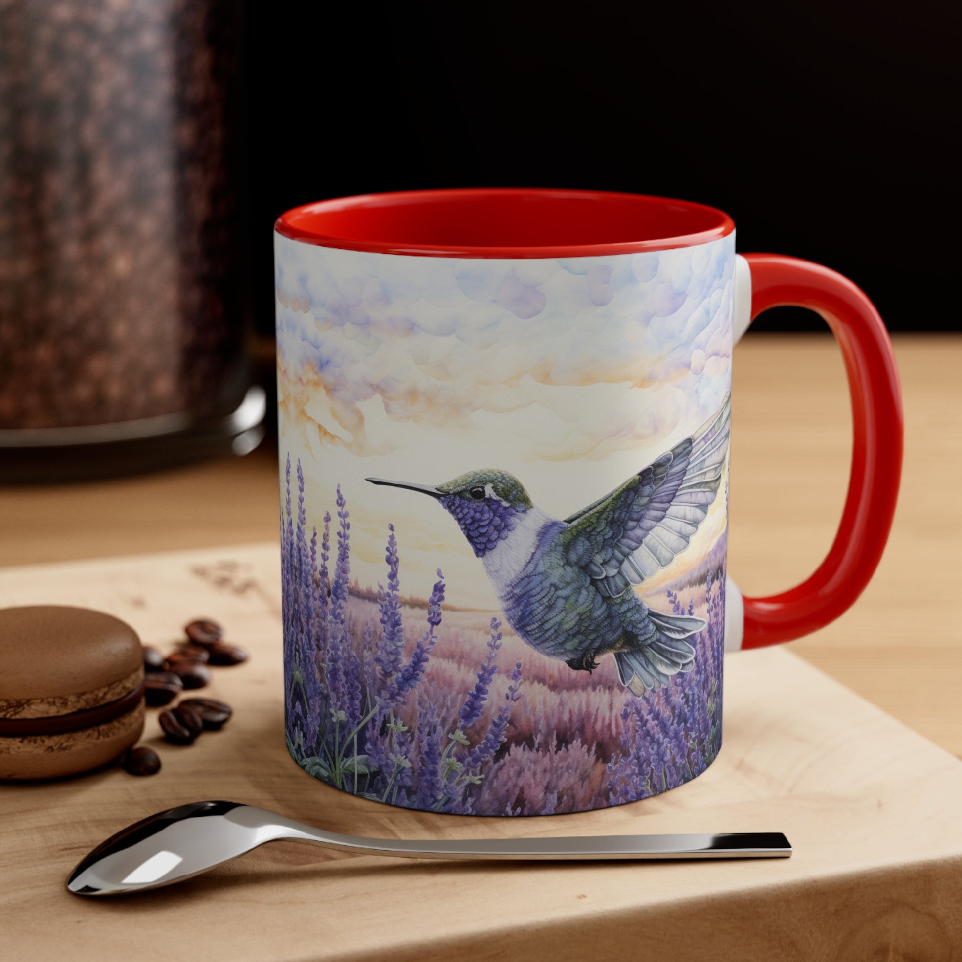 Indulge in the serene beauty of nature with our specially crafted coffee mug, adorned with a watercoloured painting of a hummingbird in a lavender field. This exquisite design captures the delicate grace of a hummingbird as it hovers amidst a sea of fragrant lavender blossoms. The soft, watercoloured hues create a tranquil scene that's perfect for enjoying your morning coffee or afternoon tea. Crafted from high-quality materials, this mug is not only a functional beverage holder but a piece of art that brings the calming essence of nature to your daily routine. Whether for yourself or as a thoughtful gift for a nature lover, this coffee mug adds a touch of elegance and inspiration to any moment. Enjoy the soothing embrace of nature with each sip!