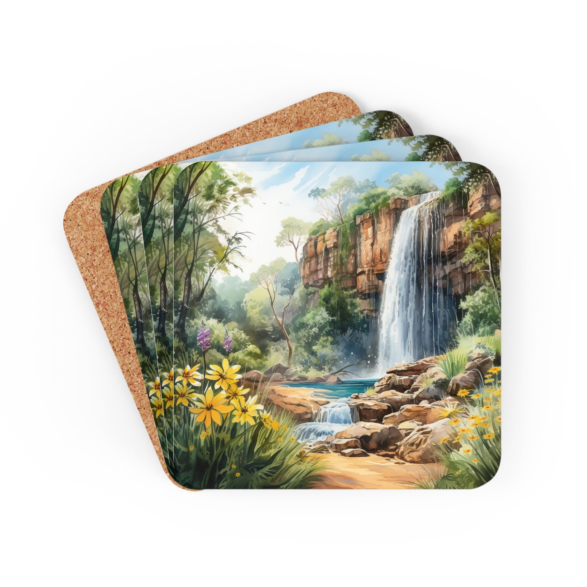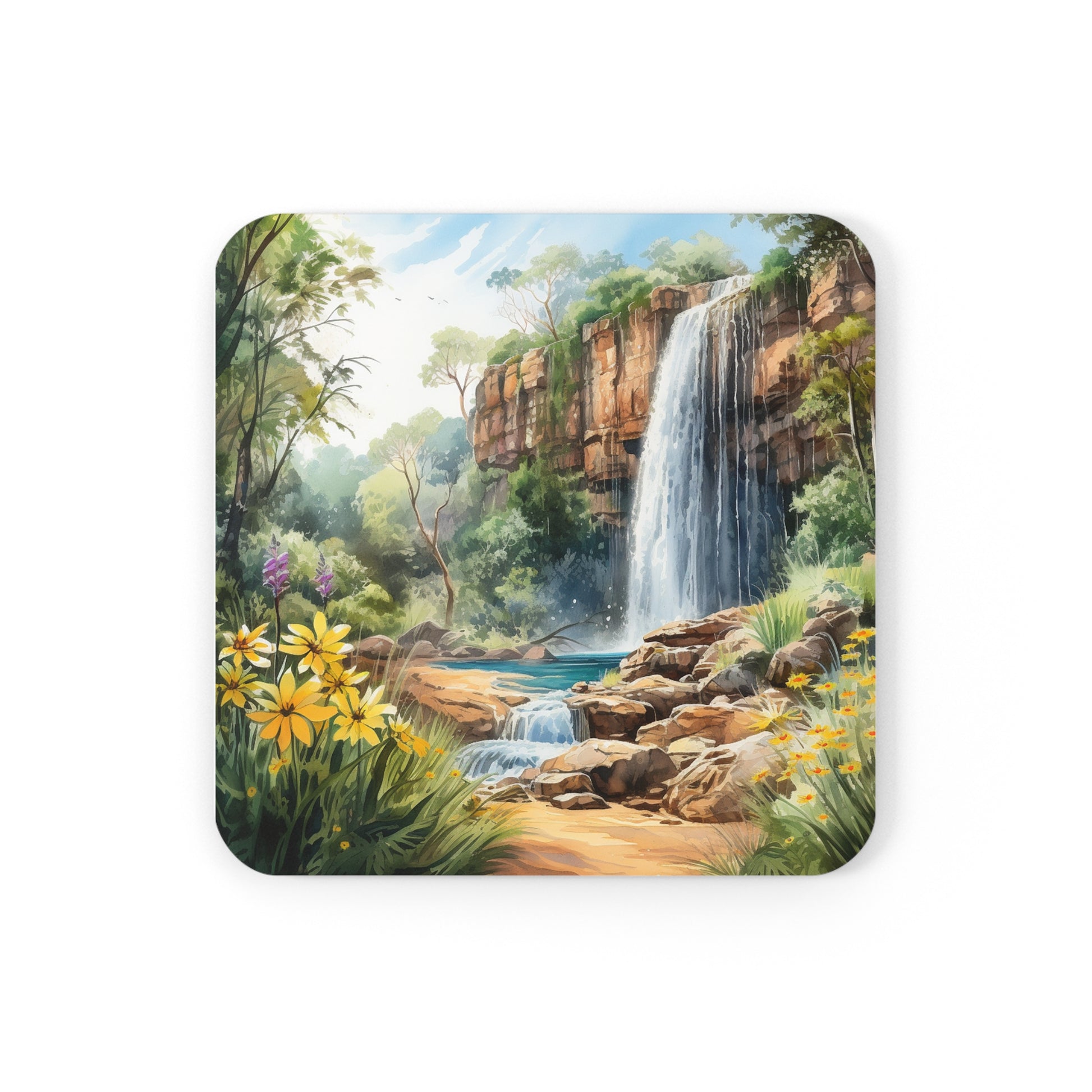 Introduce a splash of nature's beauty into your home with our set of 4 coasters, each depicting a watercoloured sketch of a waterfall surrounded by native Australian plants on a bright sunny day.