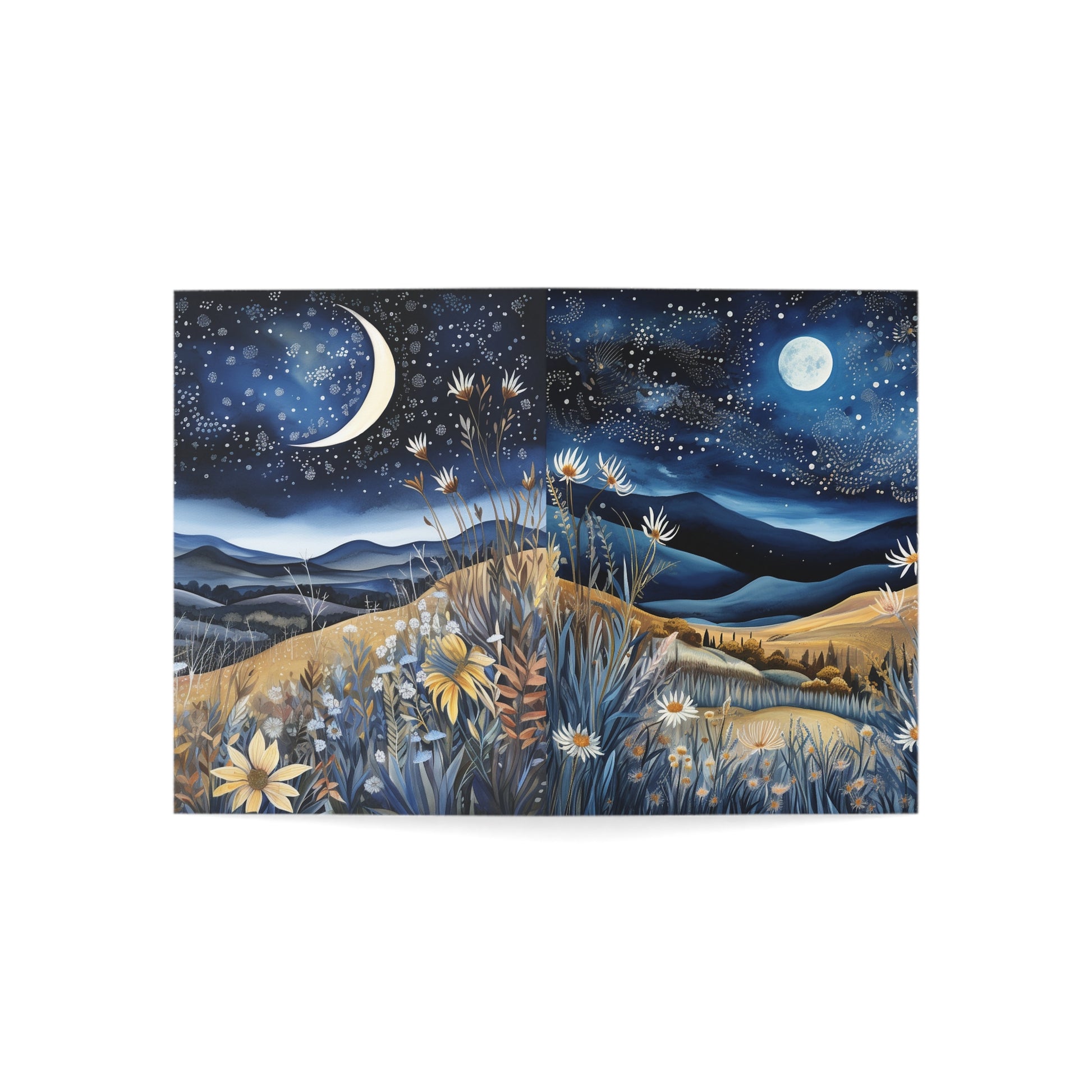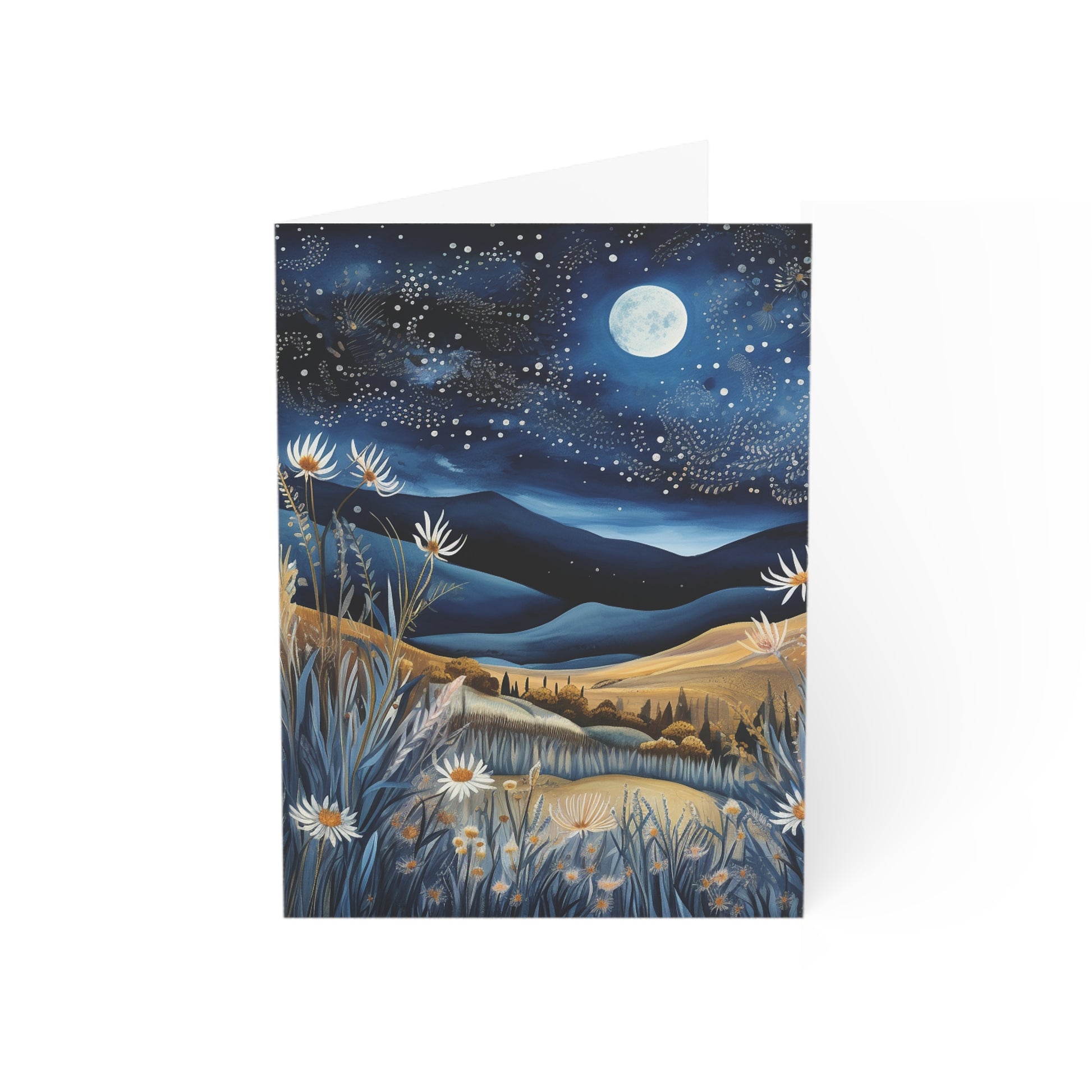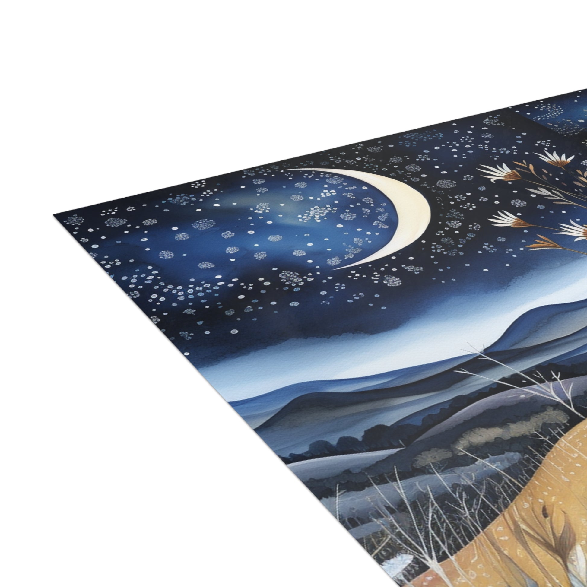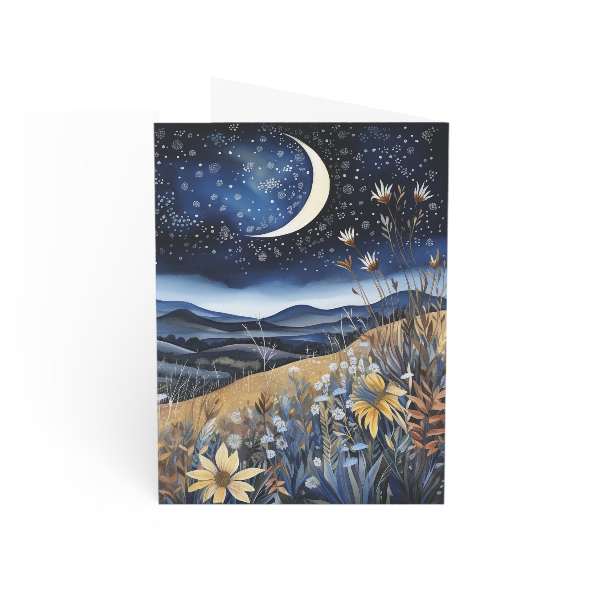 This card displays a breathtaking watercoloured sketch. The majestic Australian mountains rise in the distance, their silhouettes painted in soft shades of indigo and lavender. Nestled at their base, native plants like the waratah, banksia, and kangaroo paw sway gently, their details captured with delicate strokes and hues of green, red, and gold. Above, the vast expanse of the night sky is sprinkled with countless stars, twinkling like diamonds on a canvas of deep blues and purples. A luminous half-moon casts a silvery glow, bathing the landscape in a serene light.
