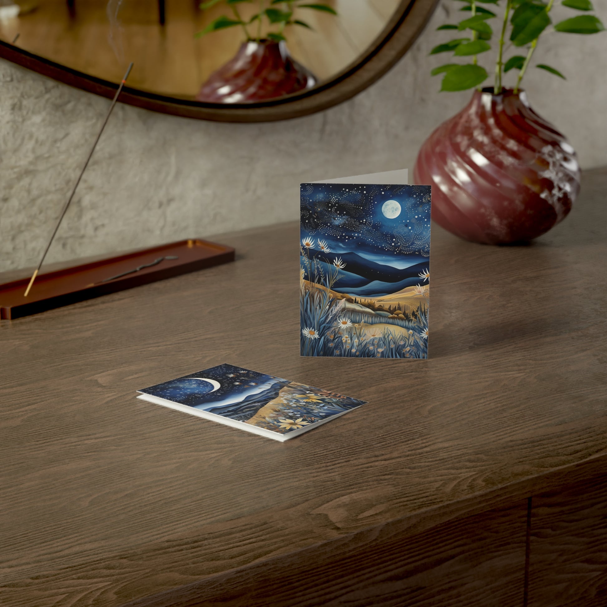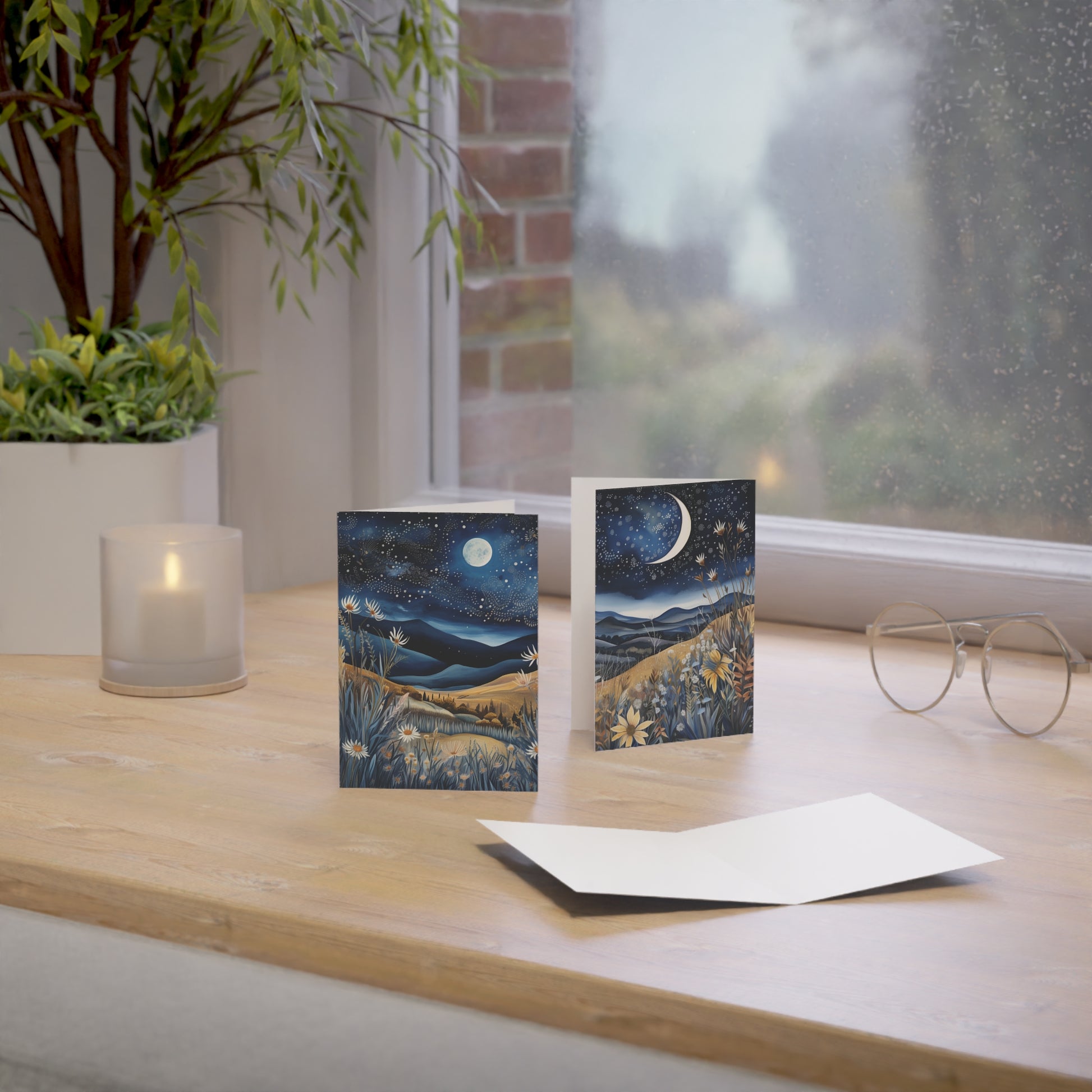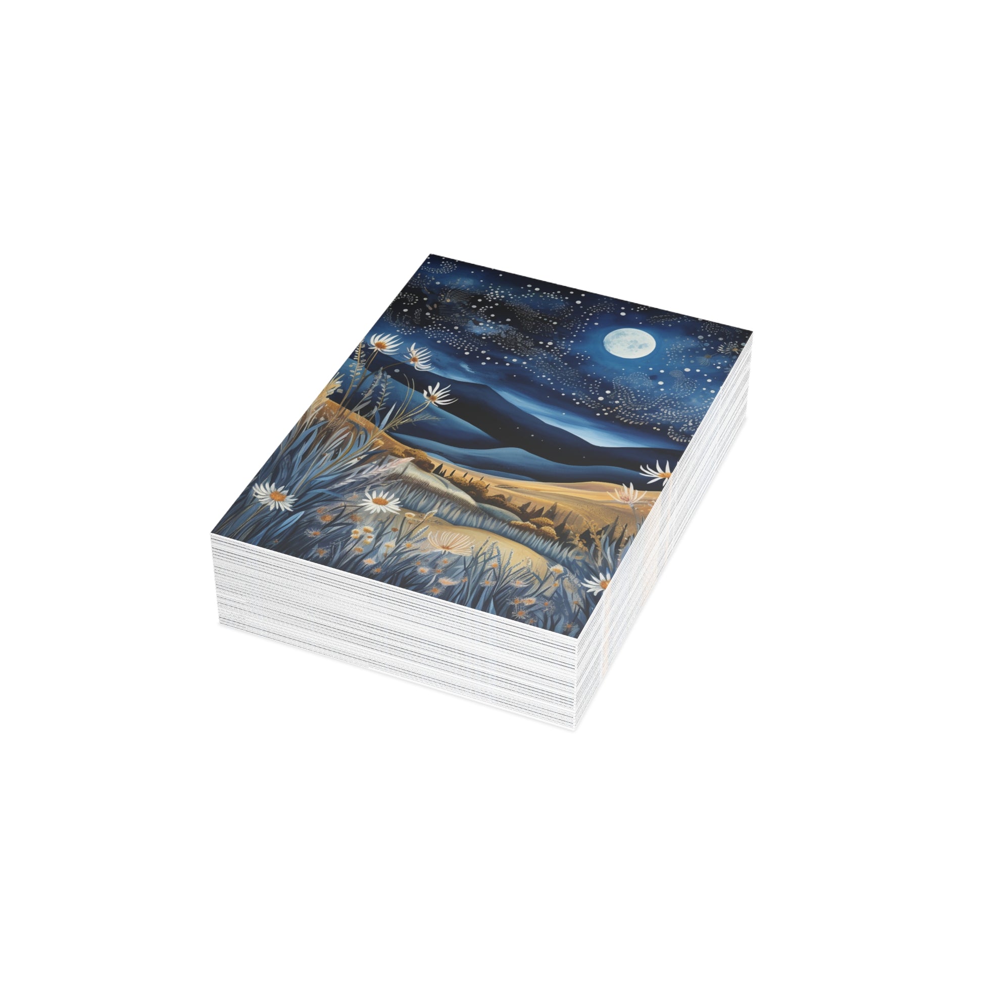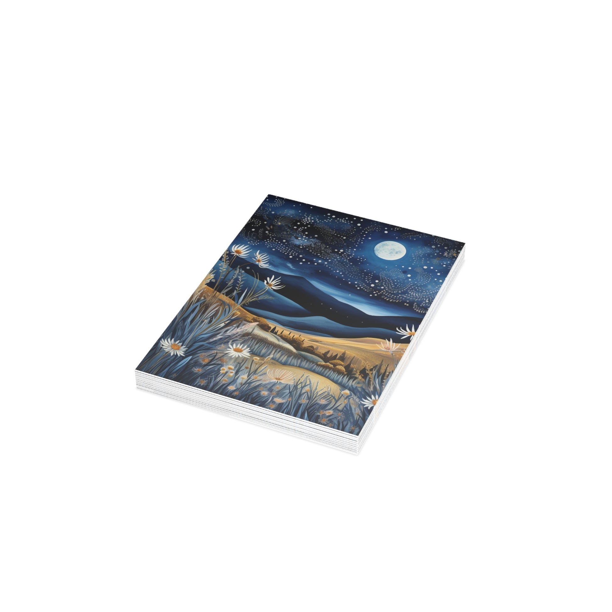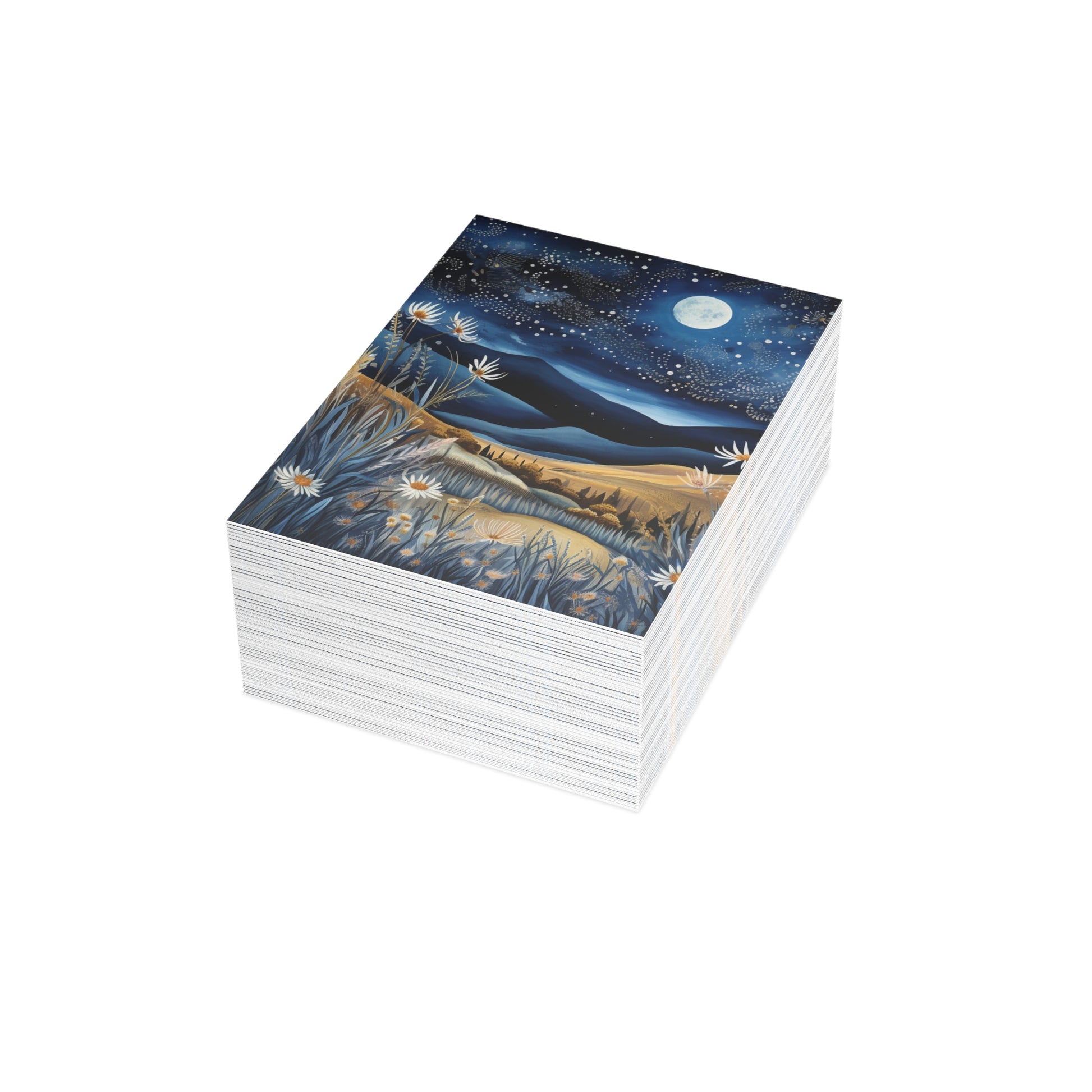 This card displays a breathtaking watercoloured sketch. The majestic Australian mountains rise in the distance, their silhouettes painted in soft shades of indigo and lavender. Nestled at their base, native plants like the waratah, banksia, and kangaroo paw sway gently, their details captured with delicate strokes and hues of green, red, and gold. Above, the vast expanse of the night sky is sprinkled with countless stars, twinkling like diamonds on a canvas of deep blues and purples. A luminous half-moon casts a silvery glow, bathing the landscape in a serene light.